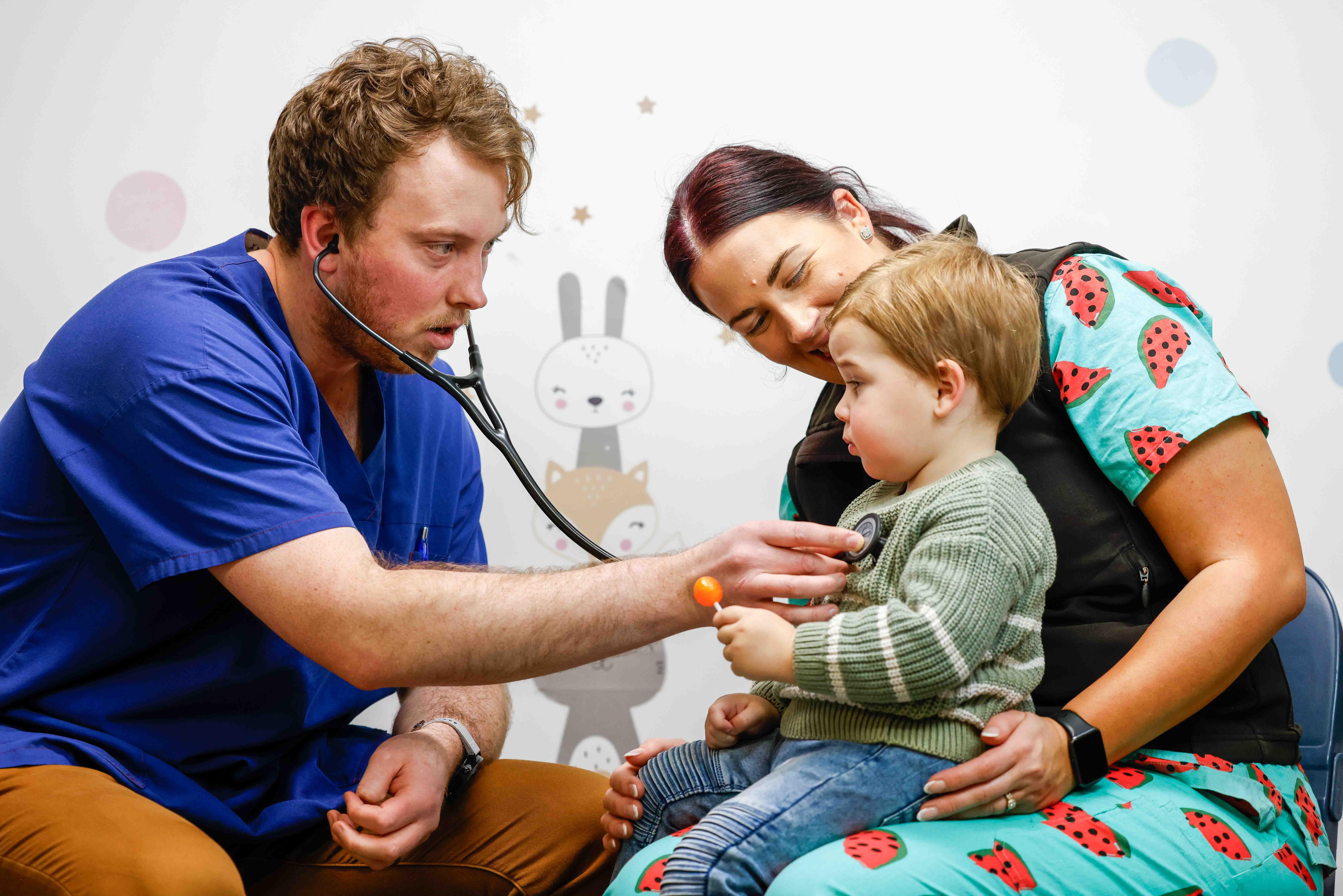 Dr Austin Hollamby with Sam (child) and nurse Sarah Evans